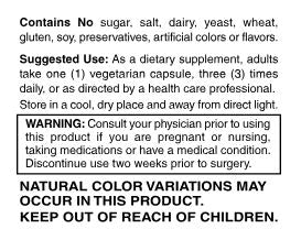 Suggested Use: As a dietary supplement, adults take one (1) capsule, three (3) times daily, or as directed by a health care professional.