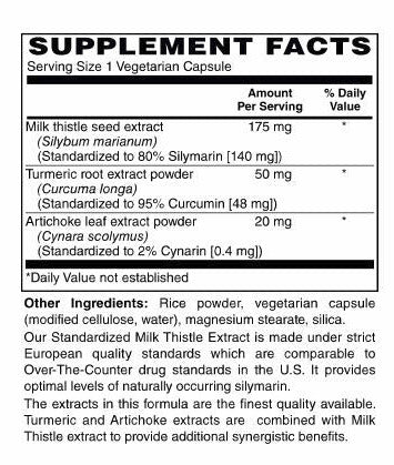 Featuring European Milk Thistle extract standardized to 80% Silymarin (140mg per capsule) with Turmeric and Artichoke Extracts.