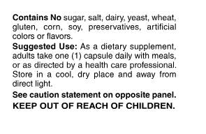 Suggested Use:As a dietary supplement, adults take one (1) capsule daily with meals, or as directed by a health care professional. Store in a cool, dry place and away from direct light.