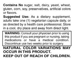 Suggested Use: As a dietary supplement, adults take one (1) vegetarian capsule daily, or as directed by a health care professional. Store in a cool, dry place and away from direct light.